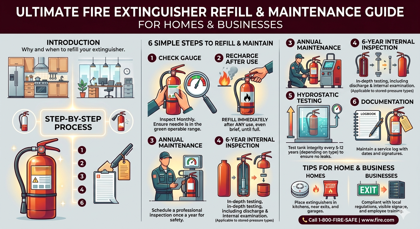 A refill involves several steps: draining any remaining agent, inspecting and cleaning the cylinder, replacing the valve and seals if needed, recharging with the correct agent and pressure, and finally testing the unit. Skipping this process or delaying it puts lives and property at serious risk.