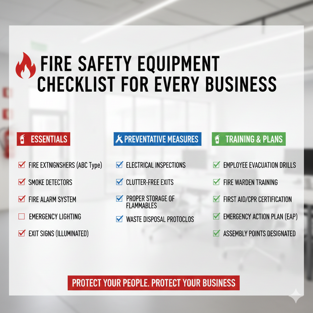 Ensuring the safety of your employees, customers, and assets should be a top priority for every business owner. Fire incidents can occur without warning, and the consequences can be devastating. One of the most effective ways to prevent major losses is by having proper fire safety equipment in place. This guide provides a detailed checklist of essential fire safety equipment for every business, helping you create a safer workplace and comply with local safety regulations.