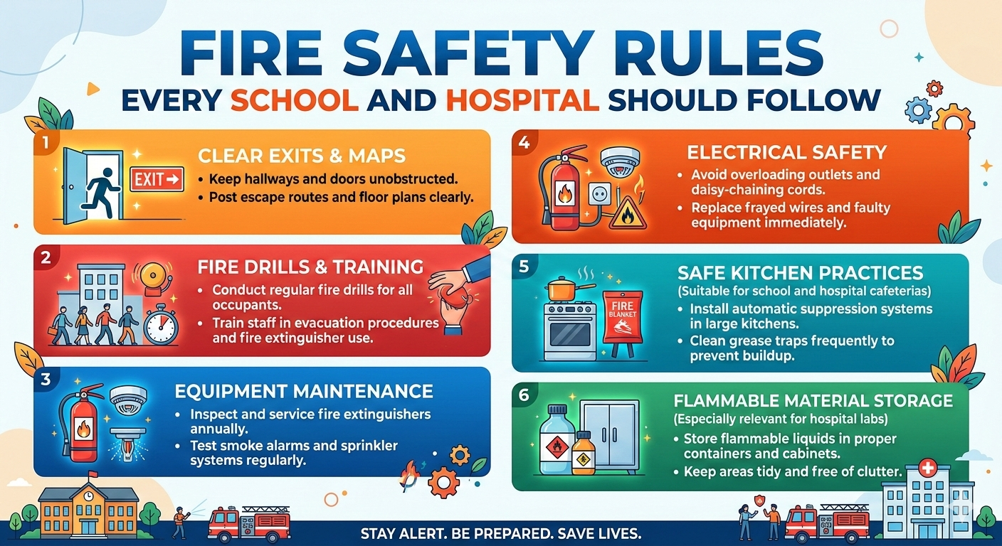By following strict Fire Safety Rules, conducting regular risk assessments, training staff, and investing in high quality equipment from trusted sources like https://firesafetytrading.com.pk/fire-safety-equipment/, schools and hospitals can significantly reduce fire risks.
