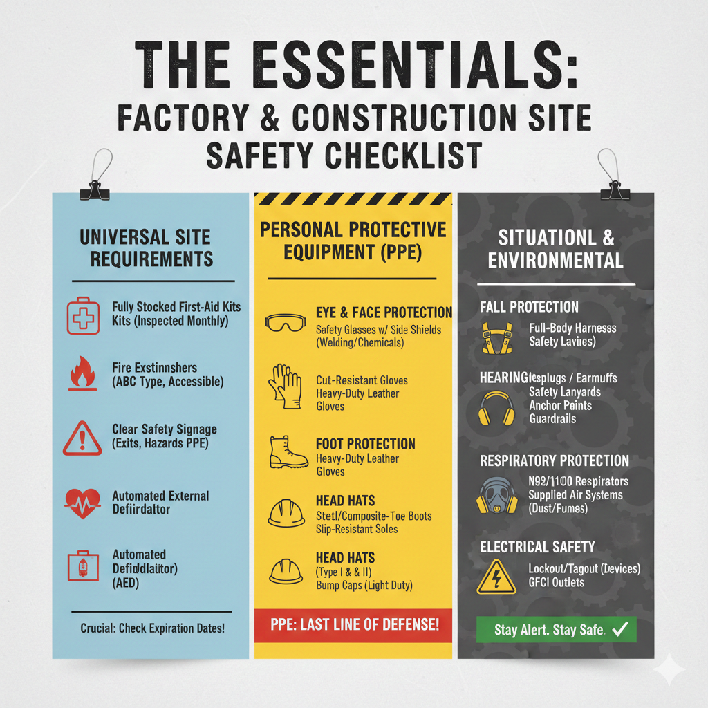 Workers in factories and construction sites are exposed to various hazards. Proper personal protective equipment (PPE) is essential to minimize risks. PPE includes:
